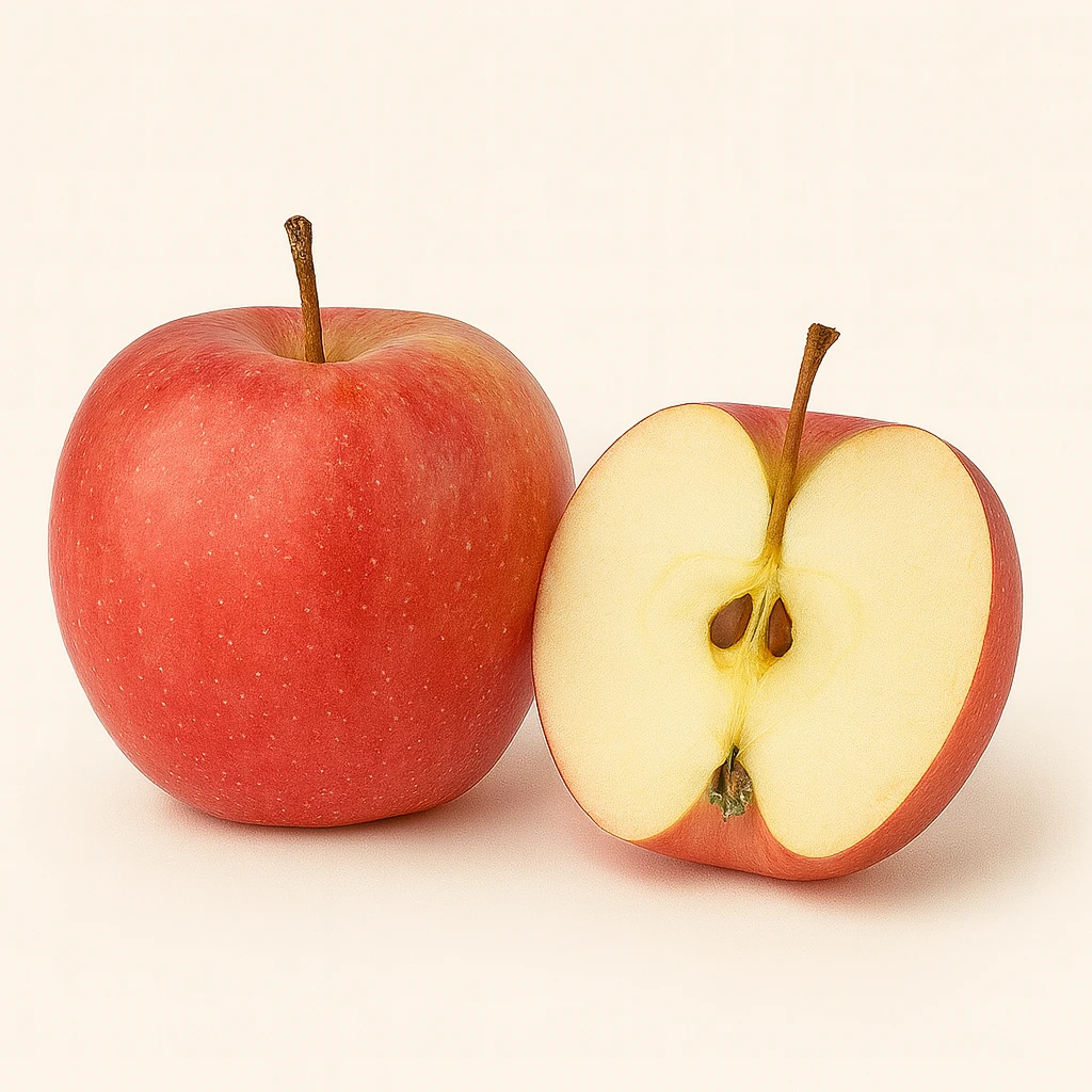 Originaire du Japon, la Fuji s’est imposée dans nos vergers pour son goût très sucré et sa texture ferme. Très croquante, elle évoque le miel ou les poires bien mûres. C’est la pomme plaisir par excellence.